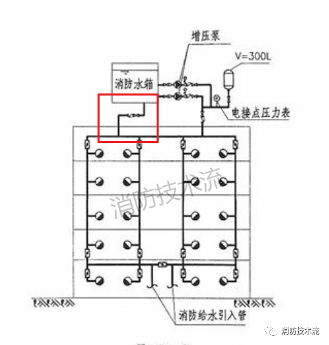 高位消防水箱的主要作用是供給建筑初期火災時的消防用水水量,當消防水滅火系統(tǒng)例如室內消火栓系統(tǒng)的穩(wěn)壓裝置設置在高位時,因高位消防水箱經過穩(wěn)壓裝置與消防管網連接,容易漏設高位水箱的并聯(lián)重力出水管(如下圖)。