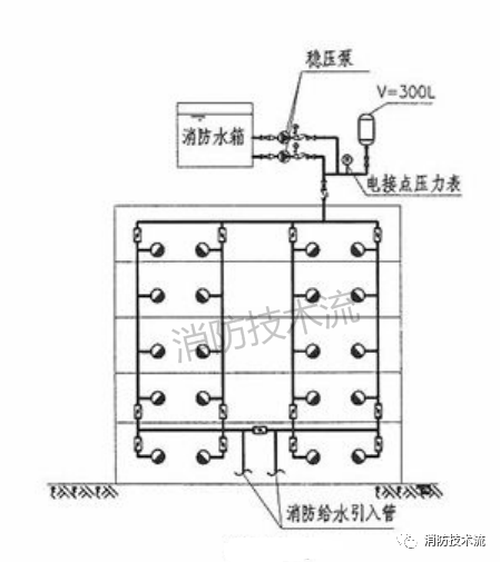 若不設并聯(lián)重力出水管與消防管網連接,初期火災的消防用水只能經過穩(wěn)壓裝置的管道供給,這樣是不符合要求的。